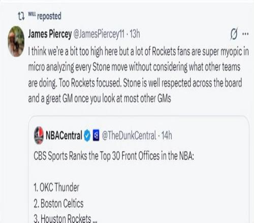 火箭记者James Piercey写道:很多人觉得斯通的排名过高了,很多火箭球迷对斯通的每一个举动都进行微观的分析,他们一直都在关注火箭队,斯通在各个方面都颇受尊重,而且你们对比一下其他球队的总经理,你就会发现斯通是一位非常出色的GM。