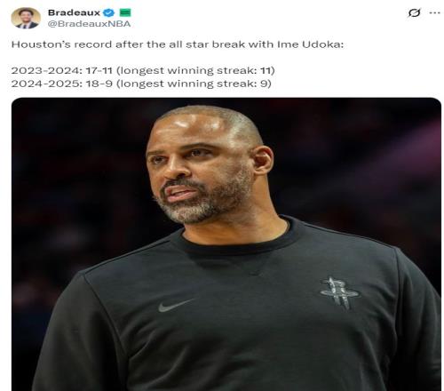 休媒还晒出乌度卡23-24赛季在全明星周末后17胜11负,24-25赛季则是18胜9负,自他加盟火箭队全明星周末后战绩都在不断攀升。