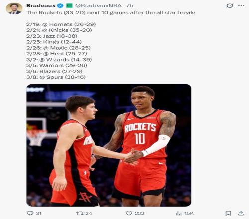 全明星周末后火箭队29天里要打完52场比赛,其中有6次背靠背,但火箭余下这29场比赛平均胜率48.6%,面对季后赛区内的球队:马刺1场、掘金1场、尼克斯2场、湖人2场、森林狼2场、猛龙1场。