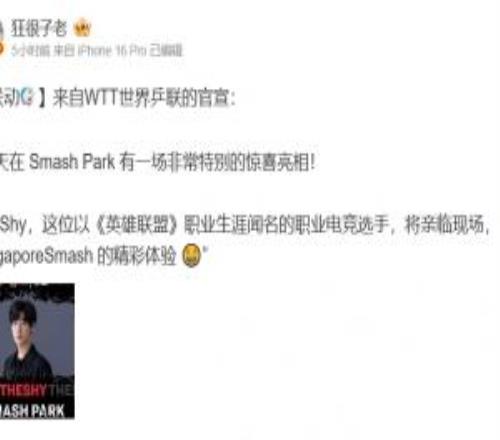 电竞体育2月27报道 今日, WTT世界乒联更新社媒,宣布《英雄联盟》S8冠军上单选手Theshy将在现场亮相。
