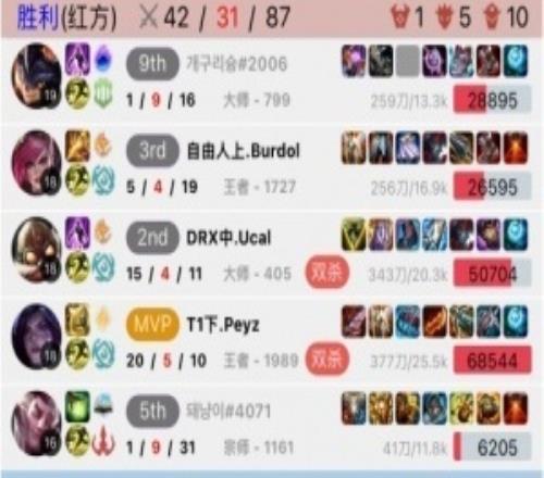 电竞体育2月13报道 根据韩服排位统计小程序显示,Peyz昨日在韩服排位中偶遇GEN上中野,Peyz操刀卡莎直接杀穿GEN上中野带队取胜!