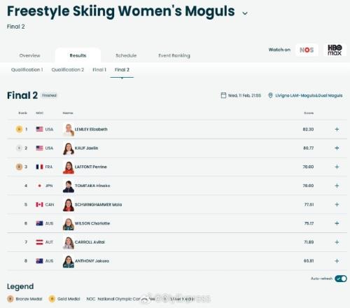 体育播报2月11日宣 2月11日,冬奥会自由式滑雪女子雪上技巧比赛结束,美国莱姆利和考芙包揽金银牌,法国拉芳获得铜牌。
