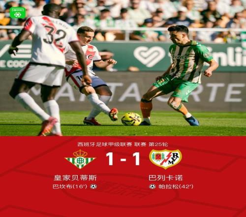 北京时间2月21日西班牙足球甲级联赛第25轮,皇家贝蒂斯主场对阵巴列卡诺。巴坎布率先破门。帕拉松扳平比分。最终比分皇家贝蒂斯1-1巴列卡诺。