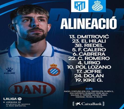 西班牙人首发:13-德米特罗维奇、23-希拉利、38-里德尔、5-卡莱罗、6-卡夫雷拉、22-卡洛斯-罗梅罗、17-卡雷拉斯、10-洛萨诺、4-乌尔科-冈萨雷斯、24-多兰、19-基克-加西亚