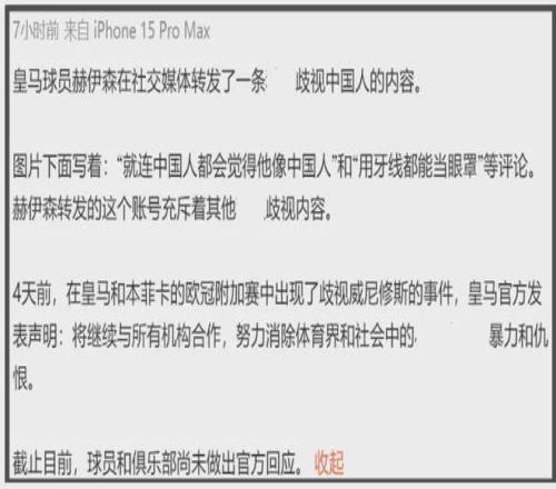 舆论升级过程中,有一位网红博主尝试联系皇马俱乐部和赫伊森本人,都没有得到正式回应,绕了一圈联系了赫伊森的队友,也就是皇马俱乐部其他球员,才被告知是赫伊森不小心碰到了才转发的,包括删除动态,都是赫伊森队友和赫伊森妈妈提醒的——他妈妈来了!他妈妈真的来了!