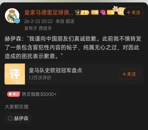 赫伊森辱华!皇马微博发布特供道歉,国际社媒、赫伊森账号没表示