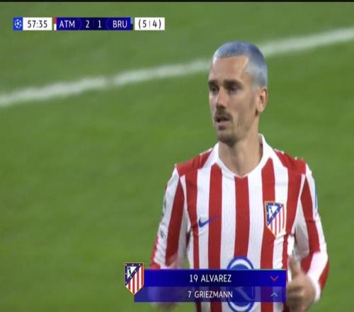 北京时间2月25日,在欧冠淘汰赛附加赛次回合马德里竞技主场与布鲁日的比赛中,格列兹曼第58分钟替补胡利安-阿尔瓦雷斯出场。
