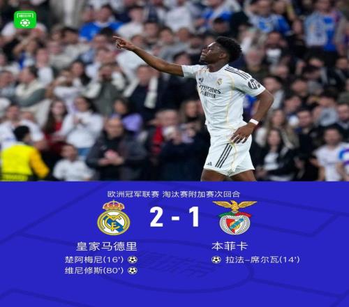 北京时间2月26日欧洲冠军联赛 淘汰赛附加赛次回合,皇家马德里对阵本菲卡。皇家马德里楚阿梅尼破门,维尼修斯破门。本菲卡拉法-席尔瓦破门。最终比分皇马 2-1 本菲卡。两回合总比分皇马3-1本菲卡。