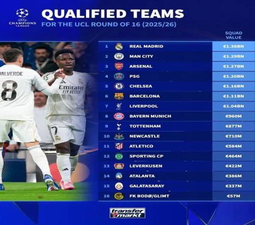 25/26赛季欧冠16强身价排行(单位:欧元)