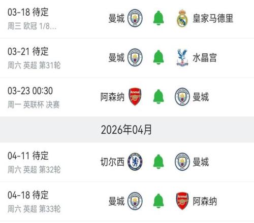 另外,曼城还将迎来魔鬼赛程,3月下旬开始,他们要先迎来主场对阵皇马的次回合比赛,接着参加对阵阿森纳的英联杯决赛,国际比赛日后,他们将在客场迎战切尔西,又在主场迎战阿森纳。