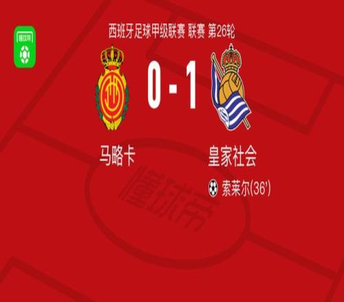 北京时间3月1日西班牙足球甲级联赛 联赛 第26轮,马略卡主场对阵皇家社会。皇家社会索莱尔破门。最终比分马略卡 0-1 皇家社会。