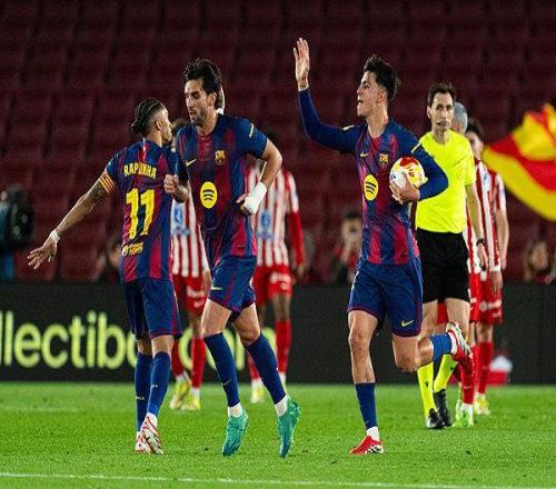 上半场,孔德开场伤退,亚马尔助攻贝尔纳尔破门,佩德里造点,拉菲尼亚操刀命中。