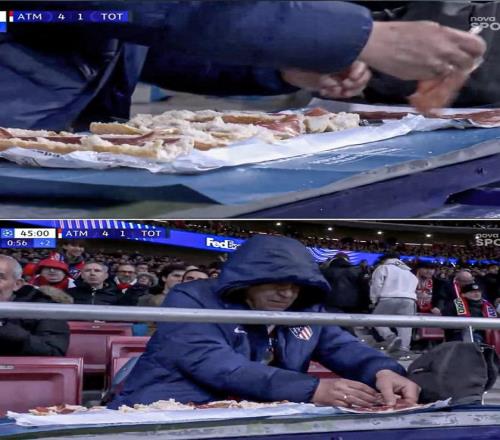 北京时间3月11日,欧冠联赛1/8决赛首回合,马德里竞技在大都会球场5-2大胜托特纳姆热刺。在比赛上半场即将结束时,一名马竞球迷在看台上悠闲地制作三明治,被官方转播镜头实时记录了下来。