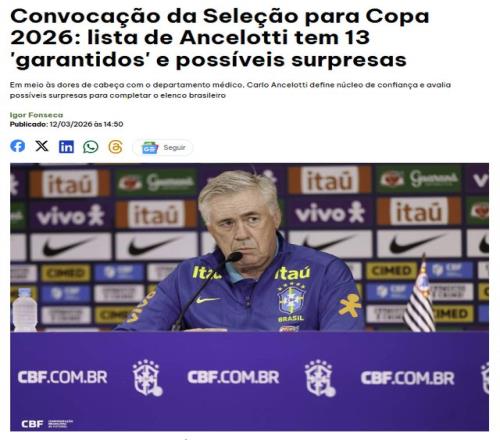 还有3个月,2026年世界杯就将开打。3月13日,巴西媒体estado透露,巴西国家队主帅安切洛蒂,将18名球员列入世界杯参...