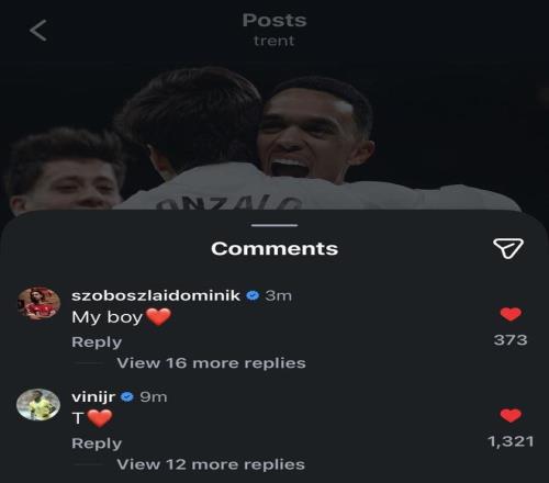 赛后,阿诺德更新社交媒体动态写道:“回来真好”随后,维尼修斯、利物浦球星索博斯洛伊评论。维尼修斯写道:“T❤️”;索博斯洛伊写道:“我的男孩❤️”