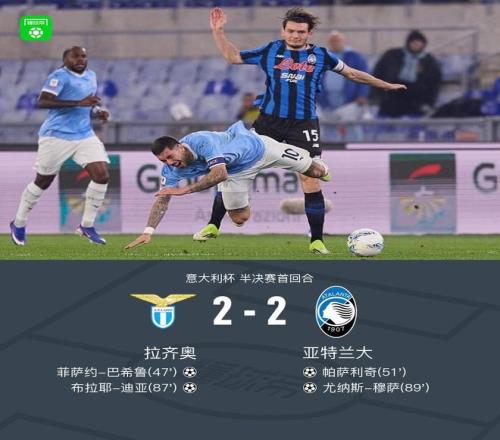 北京时间3月5日意大利杯 半决赛首回合,拉齐奥对阵亚特兰大。比赛中丹尼尔-马尔蒂尼率先助攻菲萨约-巴希鲁挑射完成破门,随后帕萨利奇禁区跟进补射破门将比分扳平,之后帕萨利奇停球出现失误,布拉耶-迪亚破门帮助球队再度领先,苏莱曼纳送出助攻,尤纳斯-穆萨破门绝平比分。全场战罢,最终比分拉齐奥 2-2 亚特兰大。