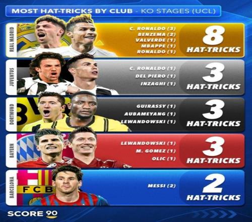 欧冠淘汰赛戴帽榜:皇马8次居首,尤文多特拜仁3次第二,巴萨第五