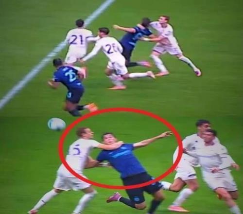 凯芙仑图拉姆的犯规动作之明显,连当值主裁判都已经将哨子含在了嘴里, 然而,就在电光火石之间,裁判收回了哨声,VAR也没有介入,进球居然有效。