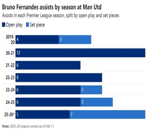 与个人巅峰时期相比,现在B费的直塞少了,但定位球助攻增加。2024年8月至今,他通过角球和任意球助攻10次,在联盟中名列前茅。同期,他的运动战助攻11次,二者几乎平分秋色。