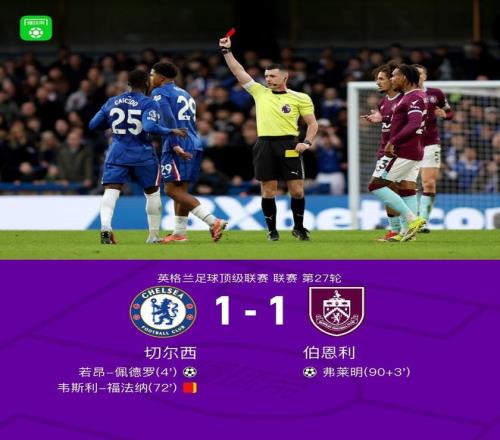 北京时间2月21日23:00,英超第27轮展开争夺,切尔西坐镇斯坦福桥球场迎战伯恩利,本场主裁判为刘易斯-史密斯。上半场,内托助攻若昂-佩德罗闪击,帕尔默失良机。下半场,韦斯利-福法纳踩人犯规吃到第二张黄牌被罚下,弗莱明补时阶段头槌绝平。最终,十人切尔西1-1伯恩利。