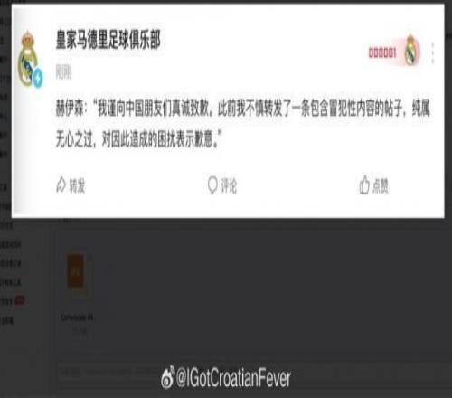 博主“IGotCroatianFever”微博晒图,收到了皇马对于赫伊森辱华事件的回复,称球员已通过中国社媒进行了道歉。皇马回复邮件内容:尊敬的先生/女士:关于您的邮件,我们在此告知,球员已按照随附新闻稿中的表述,在中国社交媒体上致歉:“我为无意中分享了冒犯华人社区的帖子而道歉。这是一次无心之失,并无任何恶意。”