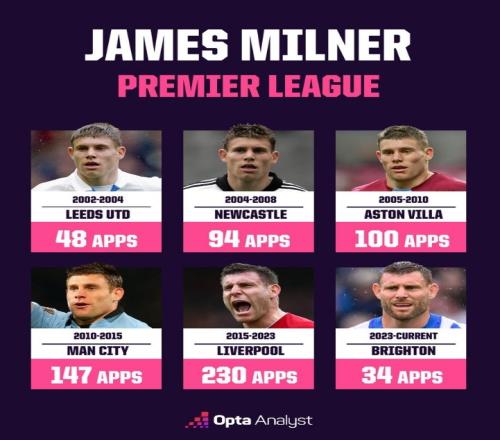 体育播报2月12日宣 在本轮英超布莱顿0-1不敌维拉的比赛中,米尔纳替补登场,完成个人英超第653次出场,追平了巴里保持的英超历史出场纪录,以下为米尔纳英超生涯代表各球队出战场次分布: