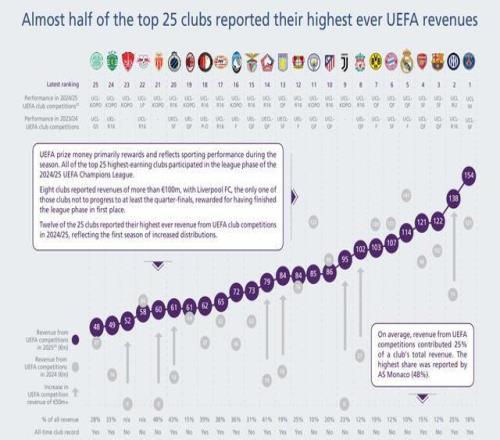 在这25家俱乐部中,有12家在2024-25赛季报告了其在欧足联俱乐部比赛中有史以来最高的收入,这反映了分配增加的首个赛季。
