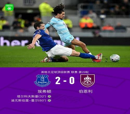 北京时间3月4日英格兰足球顶级联赛第29轮,埃弗顿主场对阵伯恩利。上半场塔尔科夫斯基头球破门,下半场迪尤斯伯里-霍尔破门扩大比分。最终比分埃弗顿 2-0 伯恩利。