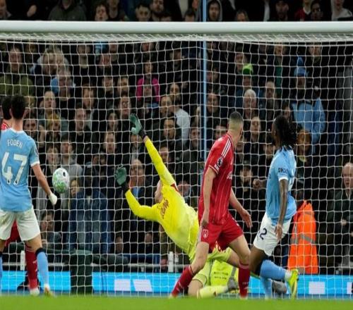 比赛开始后曼城没有意外立马展开攻势,第7分钟,福登前场卸球回敲,塞门约闪开角度爆射击中了边网;第19分钟,哈兰德前场积极反抢后断球,B席随即跟进低射射门被泽尔斯扑住;第23分钟,福登外围突施冷箭,再次被泽尔斯化解;第26分钟,森林终于打出一次像样的反击,不过吉布斯-怀特的跑位穿插低射被状态稳定的多纳鲁马封出。