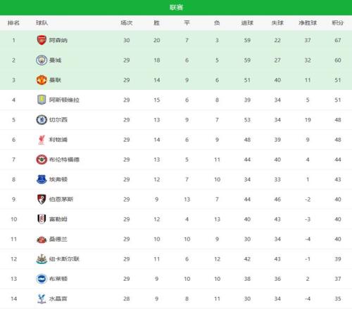 英超第29轮,阿森纳、曼城、切尔西、维拉、森林队等多家豪门联手出击,争冠的、争四的、保级的,几乎所有悬念都在这一轮被重新点燃。先赛的阿森纳客场1-0险胜布莱顿,萨卡打入全场唯一进球,豪取联赛3连胜;切尔西客场4-1逆转阿斯顿维拉,佩德罗上演帽子戏法,蓝军反超利物浦冲上积分榜第五;曼城主场2-2被保级球队诺丁汉森林逼平,爆出超级大冷,在少赛一场的情况下,落后榜首阿森纳7分。