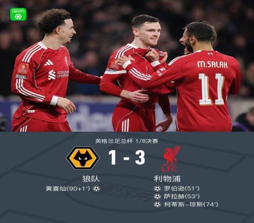 北京时间3月7日英格兰足总杯 1/8决赛,狼队对阵利物浦。狼队黄喜灿破门。利物浦罗伯逊破门,萨拉赫破门,柯蒂斯-琼斯破门。最终比分狼队 1-3 利物浦。