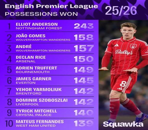 北京时间3月9日,知名数据机构Squawka统计出了本赛季至今英超球员赢得球权次数排行榜,诺丁汉森林中场埃利奥特-安德森以243次断档领先,赖斯和索博斯洛伊进入前10。