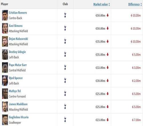 北京时间3月9日,德转更新了英超联赛球员的身价,热刺一共有17人身价有变化,其中16人下跌,罗梅罗、哈维-西蒙斯和库卢塞夫斯基均下跌1000万欧元,仅有小将索萨上涨了700万欧。