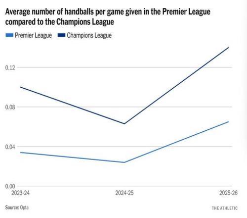 统计数据很清晰。欧冠联赛中因手球犯规被判罚点球的次数是英超的两倍多。
