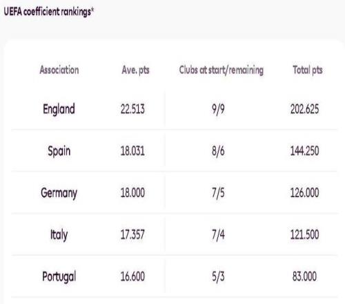 小组赛过后,英格兰在欧足联系数排名中遥遥领先,该排名衡量的是每个国家的俱乐部在本赛季欧洲三项赛事中的表现。只要英超能保持前两名的位置,那么联赛第五就能连续第二个赛季直接获得欧冠小组赛正赛资格。