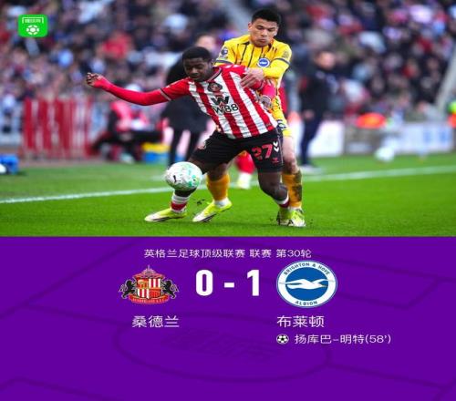 北京时间3月14日英格兰足球顶级联赛第30轮,桑德兰主场对阵布莱顿。下半场扬库巴-明特破门打入制胜球。最终比...