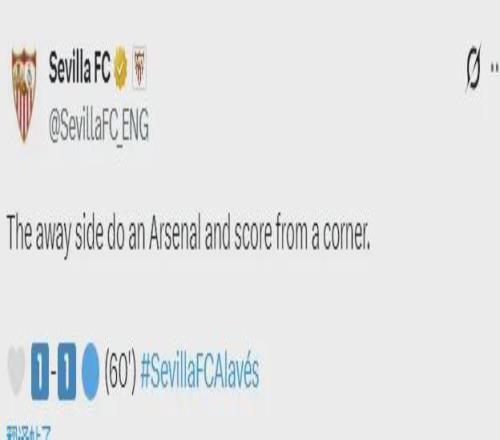 塞维利亚官推在更新比赛比分时揶揄了一把阿森纳,他们写道:“客队(阿拉维斯)像阿森纳那样,打进了一粒角球。”