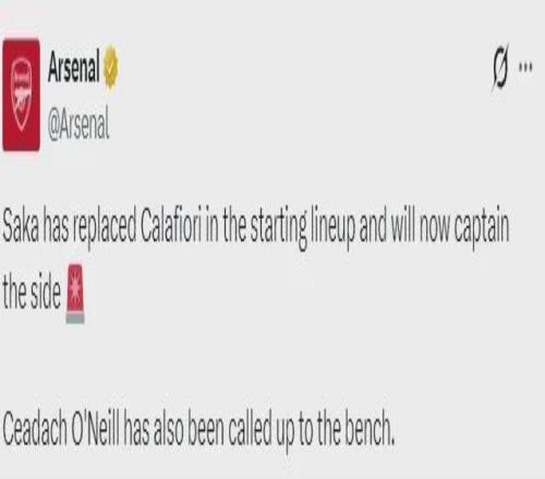 阿森纳官推确认,萨卡取代卡拉菲奥里进入了首发阵容,并且担任队长,小将奥尼尔进入了替补席。
