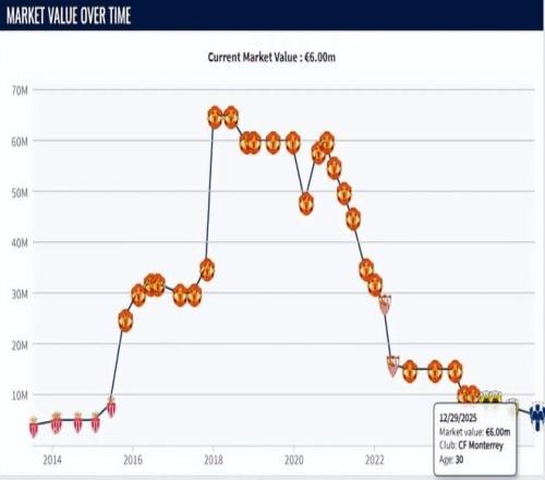 其中2015年6000万买入的马夏尔,堪称是“古早版”失败者。自摩纳哥出道后他来到曼联的,起初表现还算稳定,到2018年前后身价到过6500万的高度的。可遗憾的是之后他再无太好的机会,2020年前后则遭遇到了崩盘,身价一落千丈的。到2022年只有3000万不到。
