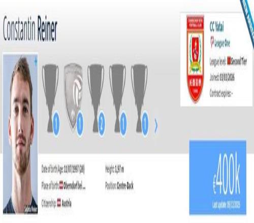 2025赛季结束后,赖纳与陕西联合合同到期离队,成为自由球员。现在他在德转上的身价为40万欧元。