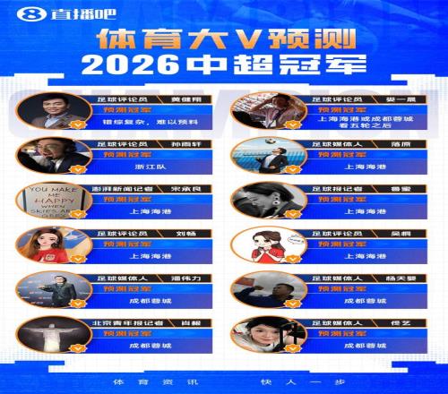 2026赛季中超联赛开赛在即,谁将是夺冠最有力的争夺者呢?一众媒体人纷纷预测,结果显示:卫冕冠军上海海港险胜,以5比4压制成都蓉城,再成中超夺冠第1大热门,四连冠不是梦。恭喜海港!近日,直播吧邀请12位媒体人和记者对新赛季的中超联赛冠军进行了预测(下图),除了2人没有给出明确答案以外,其余的10人都给出了自己的预测结果。