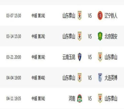 相比上海申花的天崩开局,山东泰山新赛季中超开局非常有利,前五轮“三主两客”。3月7日中超首轮,山东泰山主场迎战辽宁铁人,3月14日中超第2轮,泰山队继续坐镇主场迎战北京国安,3月21日中超第3轮,泰山队客场挑战云南玉昆,4月4日第4轮,泰山队主场迎战大连英博,4月11日中超第5轮,泰山队客场挑战河南队。