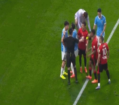 正是这个动作让成都蓉城的外援罗慕洛上前质问杨一鸣,俩人都是指着鼻子互骂,情绪相当激动,主裁判王迪上来劝架也无济于事,最后更是爆发大冲突,卷入双方更多球员,场面一度十分混乱。