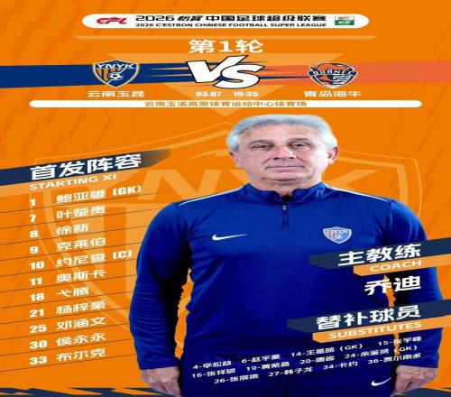 北京时间2026年3月7日消息。中超联赛第1轮今天晚上全面开打,云南玉昆主场迎战青岛海牛的比赛,双方梅花间竹般共进4球,大打攻势足球。最终,主队玉昆3-1获胜。新任主教练乔迪取得了其执教的开门红。