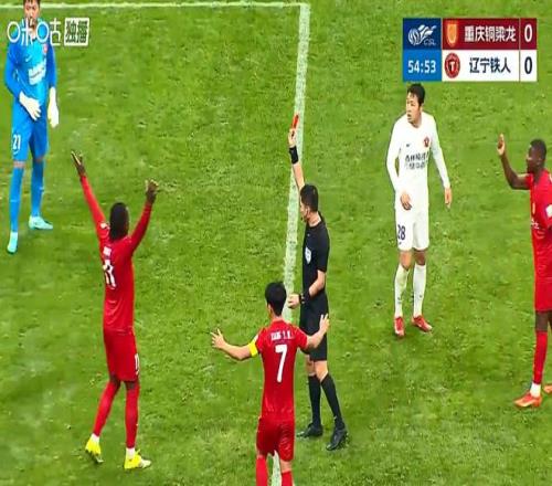 下半场,重庆铜梁龙加强进攻,效果终于在第58分钟时呈现。外援肯帕努带球突破到禁区外,客队外援瓦吉奇铲球放倒。由于是最后一名防守球员,主裁判马宁当机立断掏出红牌将其罚下,辽宁铁人开始少打1人。