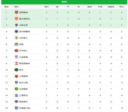 中超第二轮综述及积分榜,泰山队第5,成都领跑,四队两连败