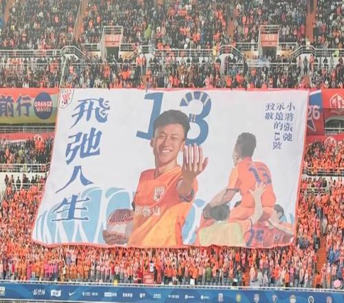 在张弛的退役仪式上,济南奥体中心看台展示巨幅TIFO:“飞弛人生。致敬永远的13号‘小将’张弛。”