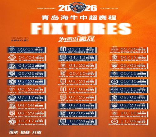 2026赛季中超联赛赛程公布,青岛海牛官方发布了俱乐部的中超赛程。海牛首轮客战云南玉昆,第6轮迎来与西海岸的青岛德比,第8轮将会主场迎战山东泰山。